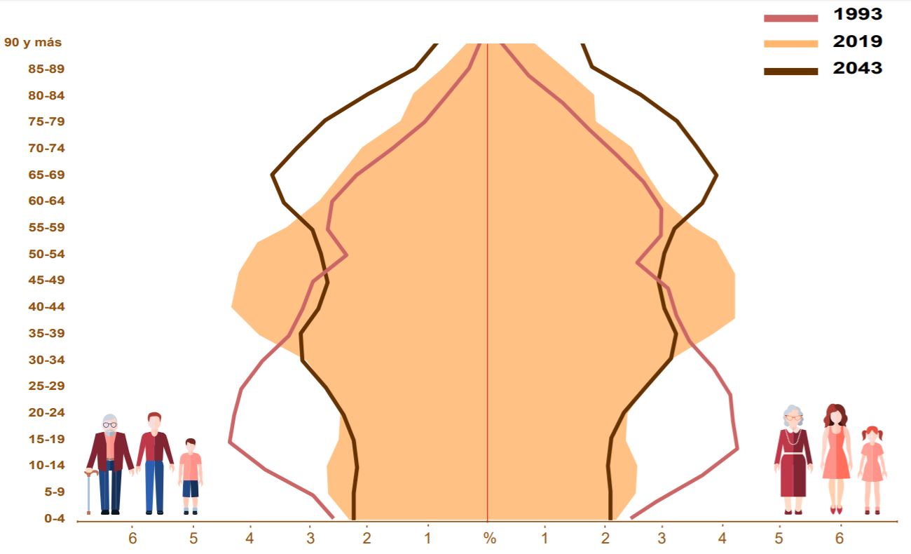 Con esta imagen puedes ir ya familiarizándote con un gráfico que veremos bastante al estudiar la población, las pirámides, que representan visualmente una cantidad de información mayor de la que de un primer vistazo parece. Por cierto, según los datos del INE, España tenía 46.934.632 habitantes el 1 de enero de 2019 (último dato disponible)