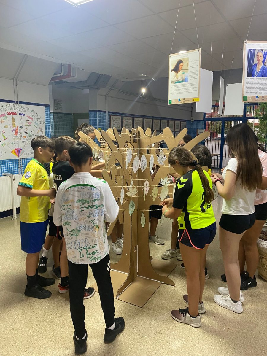Además, desde la asignatura de Oratoria se han leído unos manifiestos de compromiso junto a nuestro árbol. Un árbol que se ha ido llenando de mensajes de esperanza en unas hojas elaboradas por el mismo alumnado con papel reciclado.