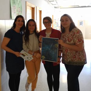 Minerva Nuñez, EstherFernández y Marina Trujillo de este año, recogiendo el premio a manos de la Jefa del Departamento de Plástica.