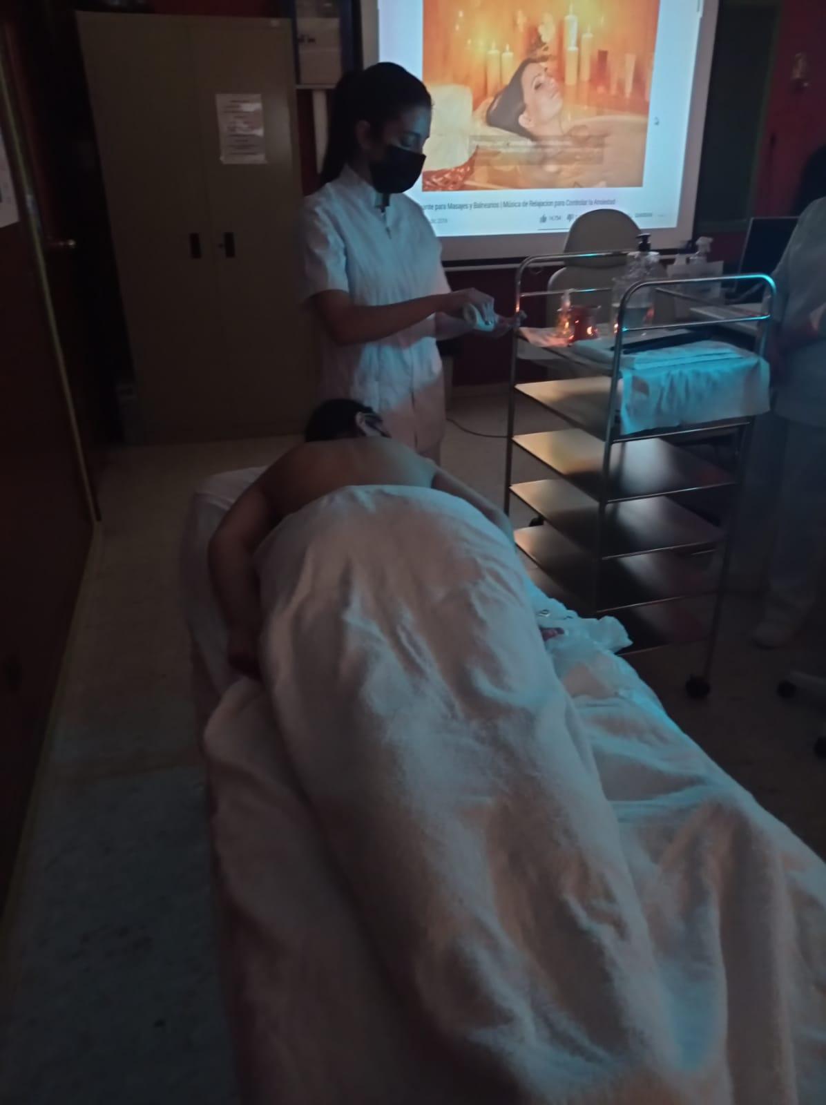 Actividades de Masaje estético con 1º EIB con la temática de «accesorios en el masaje». Masajes con piedras calientes, con pindas y accesorios de madera.
