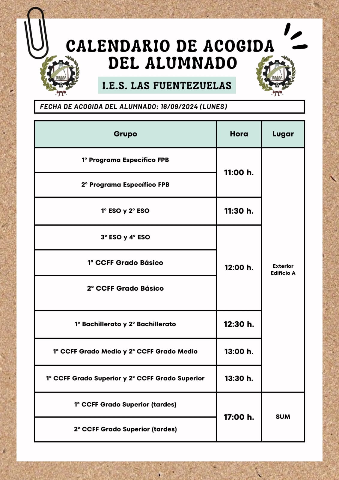 Nota informativa: el alumnado completará su horario una vez realizada la acogida siendo su salida a las 14.30 para el alumnado de la mañana.