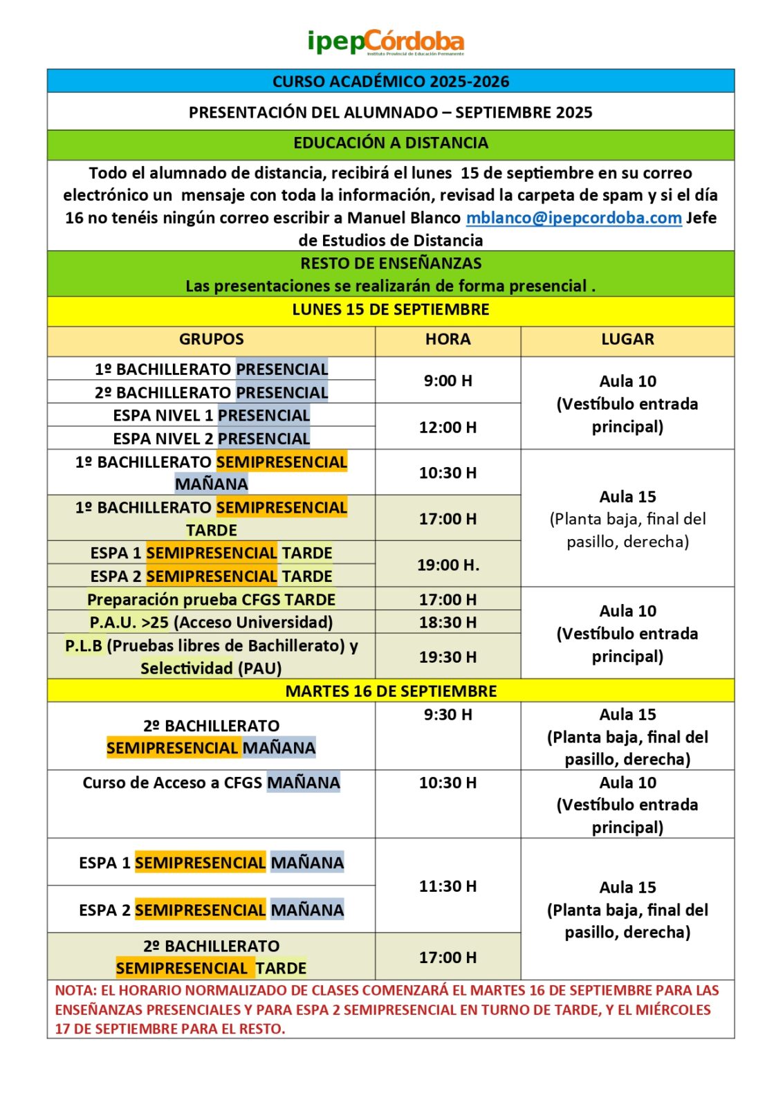 Ya estamos a punto de comenzar un nuevo curso escolar, el 2025-2026 y para ello los días 15 y 16 de septiembre, lunes y martes próximos tendremos el acto de presentación, segmentado por enseñanzas, a continuación tenéis el horario y aula de la presentación de todas nuestras enseñanzas.