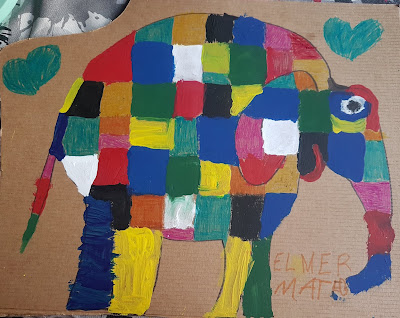 Ana ha hecho un ELMER con pintura y varios materiales . Le ha quedado precioso!!!