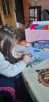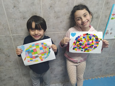 También ha hecho a ELMER pegando trocitos de papel de colores y se ha quedado precioso!!
