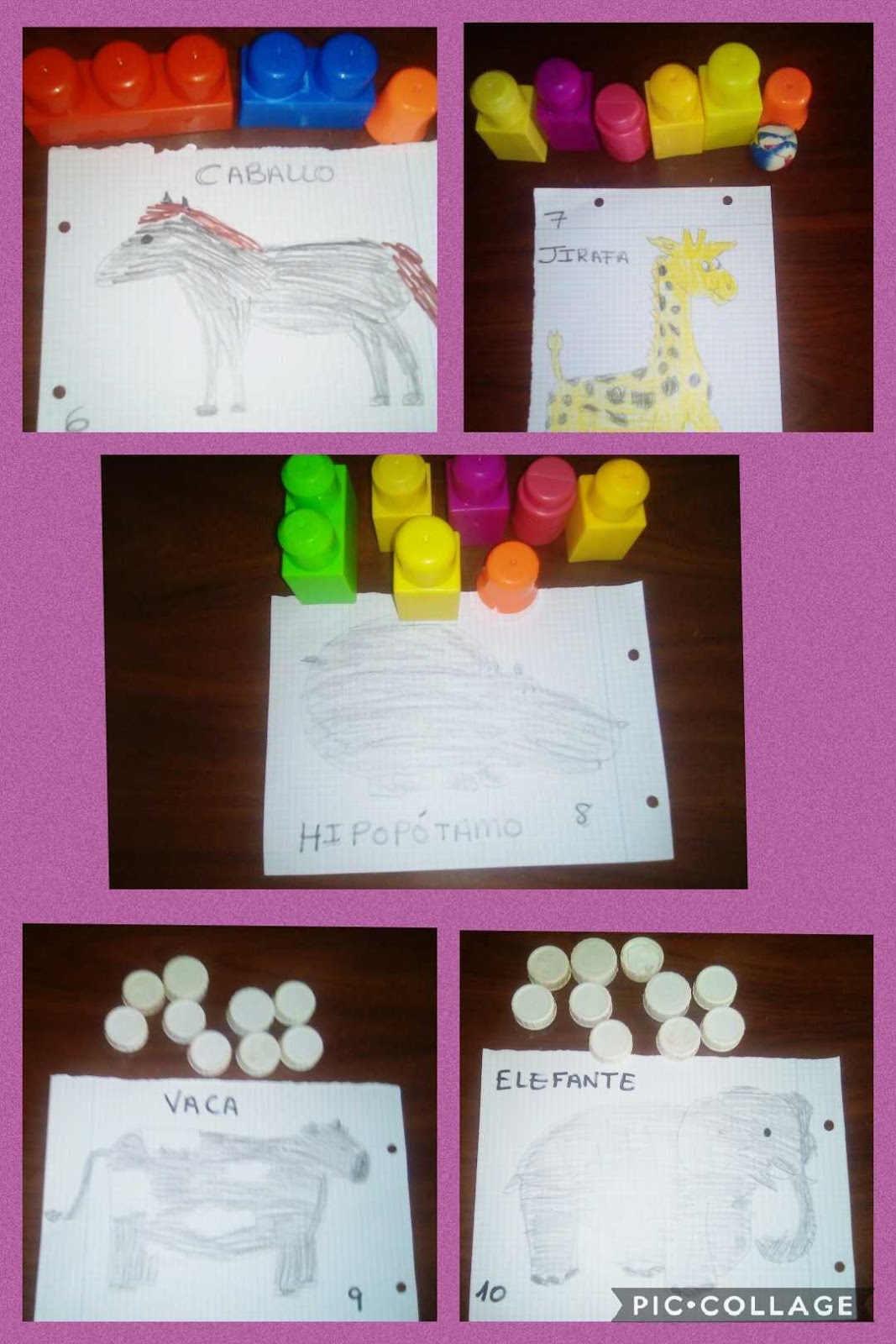 ROCIO nos enseña todo lo que ha hecho, primero ha coloreado 10 animales y después ha colocado tantas piezas de construcción como indica el número que ha escrito cerca de cada animal.