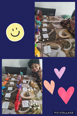 ¡JUANMI ha colocado los dinosaurios que más le gustan, ha puesto la grafía del número y al final le ha colocado unas caquitas muy chulas que ha hecho con plastilina.