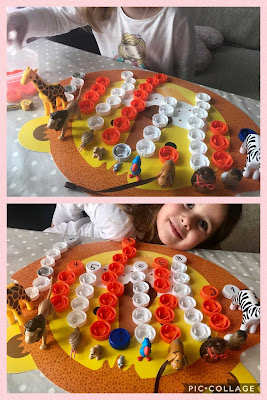 ABRIL ha cogido los animalitos que más le gustan y ha colocado tantos tapones como caquitas ha hecho cada animal.