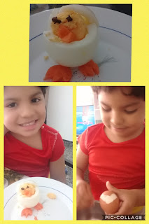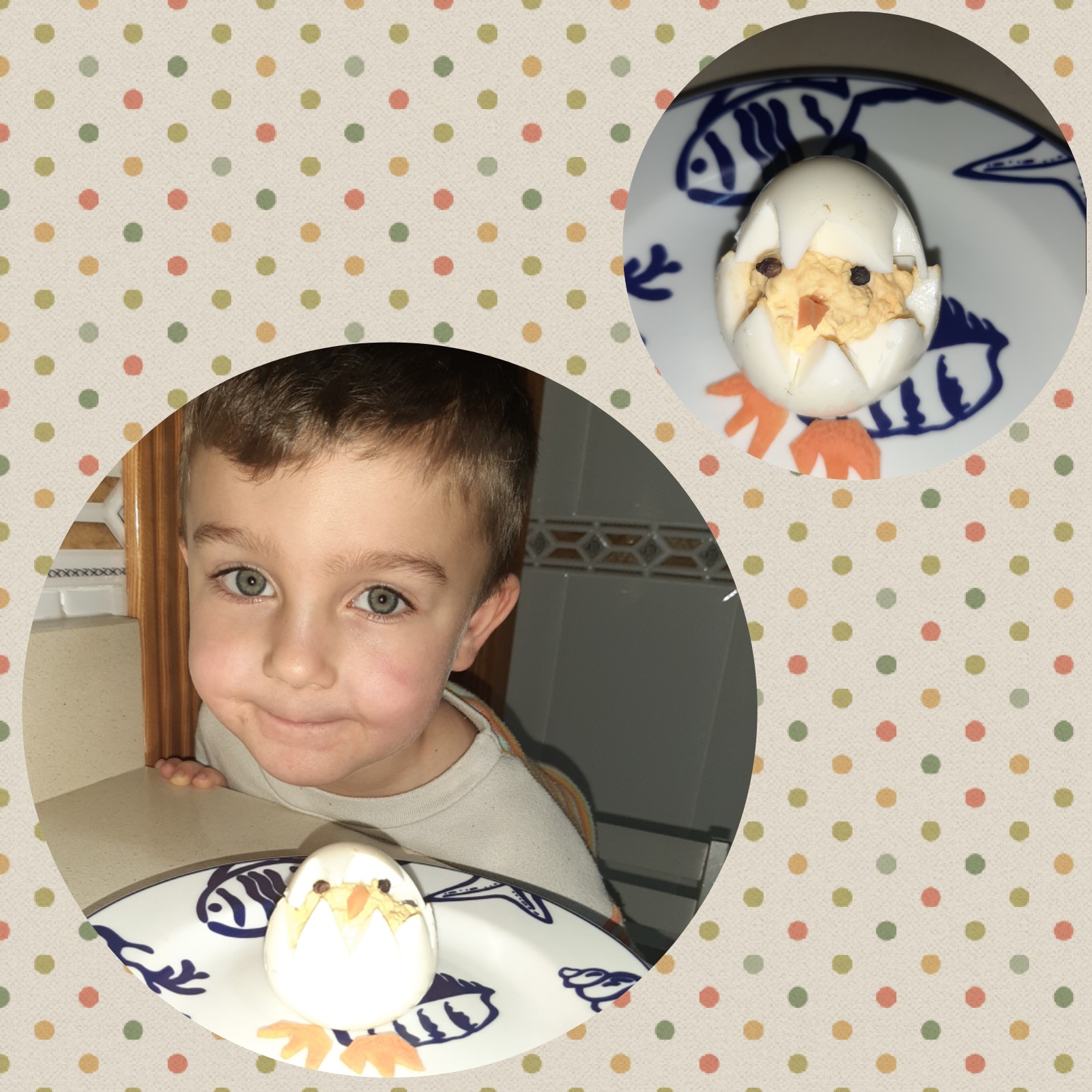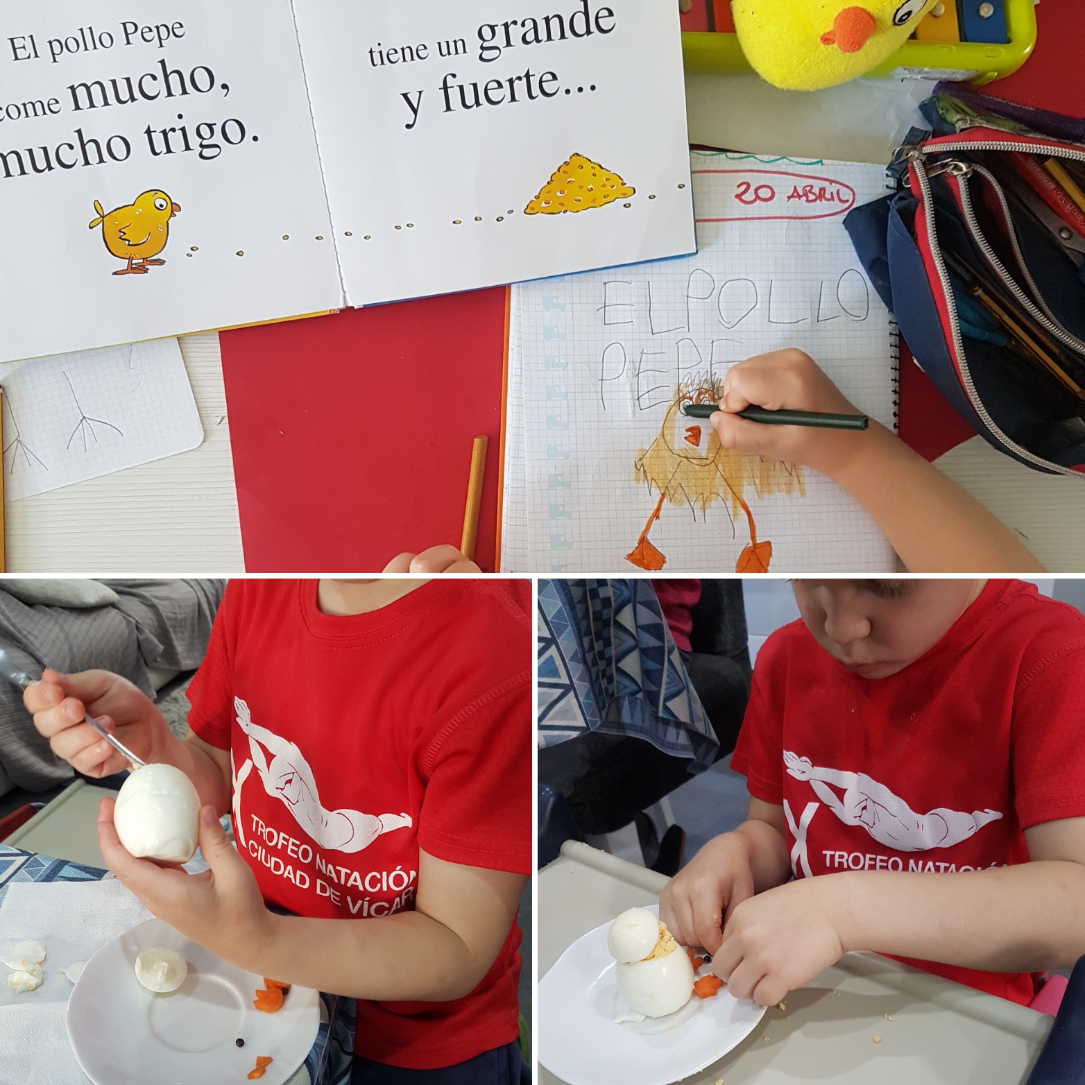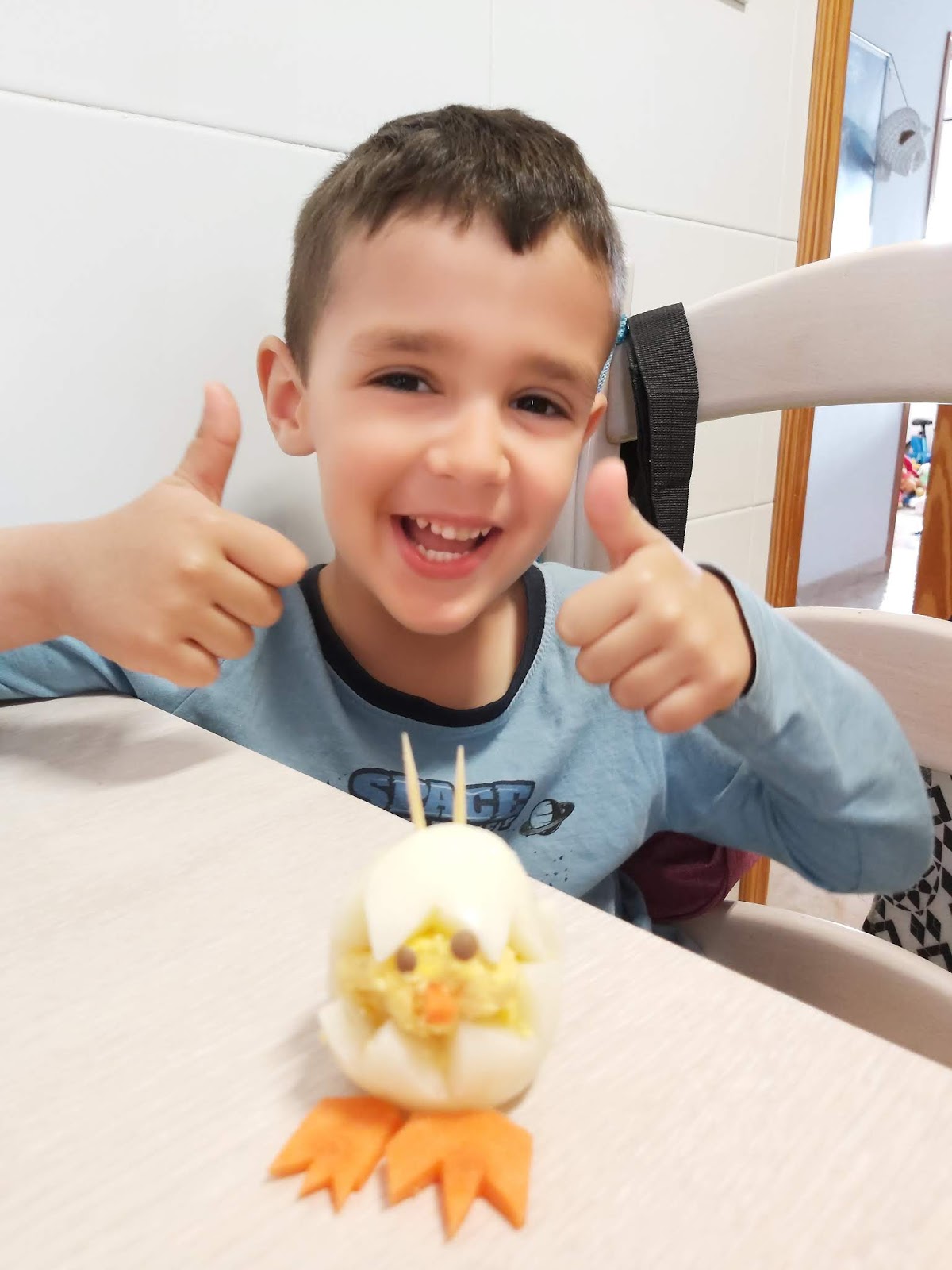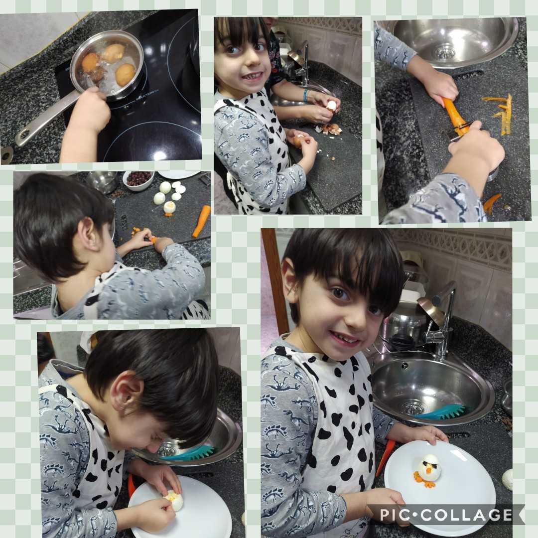 Mirad como le quita León con mucho cuidado la cáscara del huevo y así de bien le ha salido su pollito Pepe.
