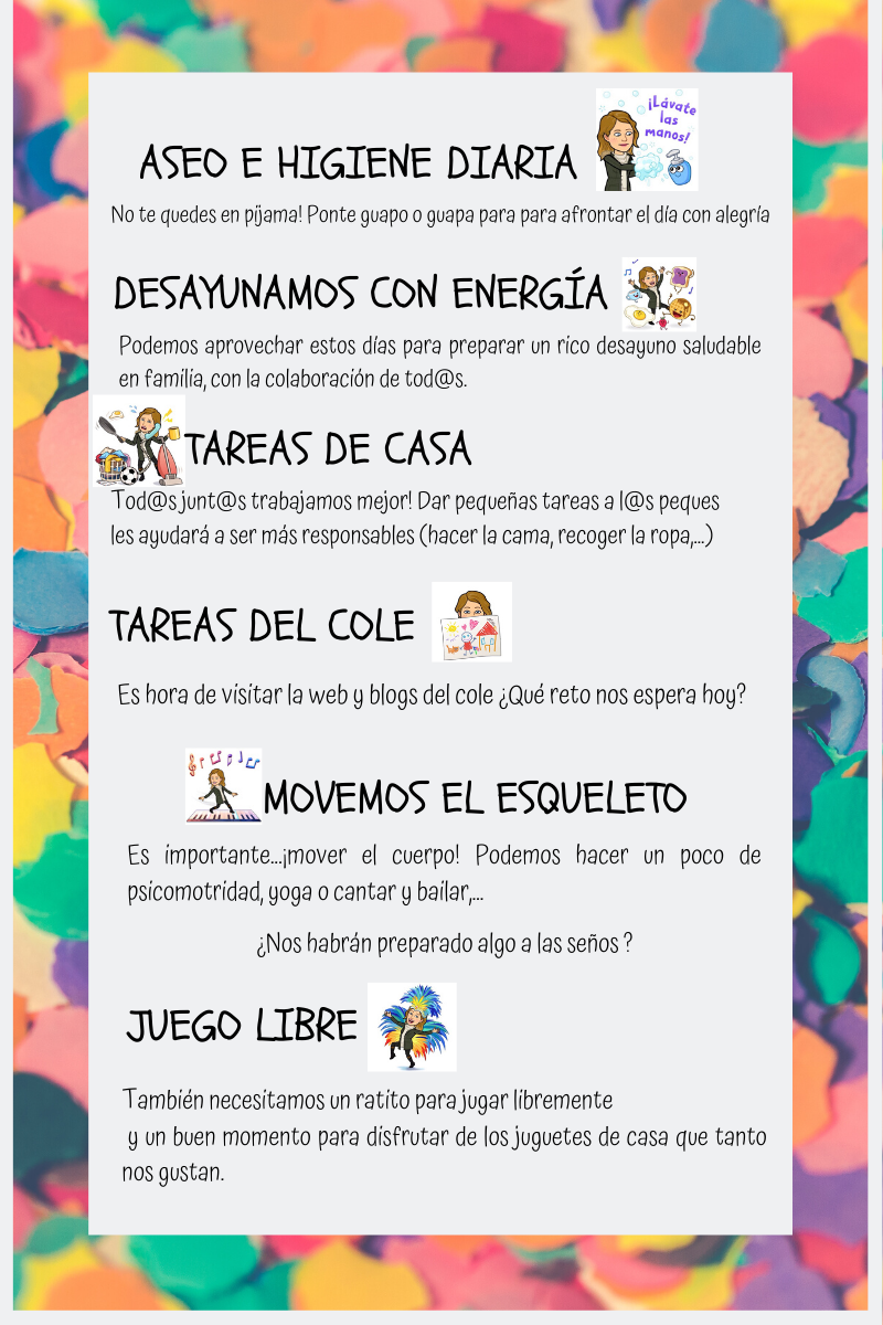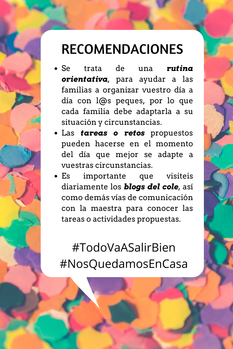Las seños os proponemos, que busquéis por casa prendas de ropa (de cualquier miembro de la familia), complementos, utensilios… Del color de la emoción que sintamos hoy ¡Todo vale! Vamos a fabricarnos un disfraz casero. Es el momento de ser creativ@s e imaginativ@s…