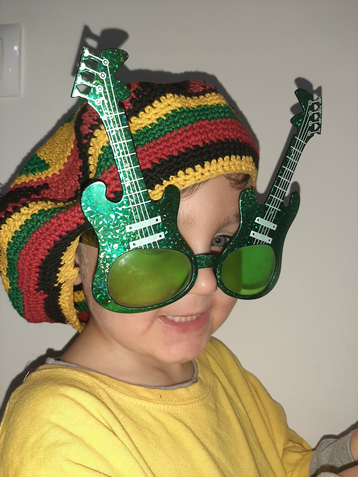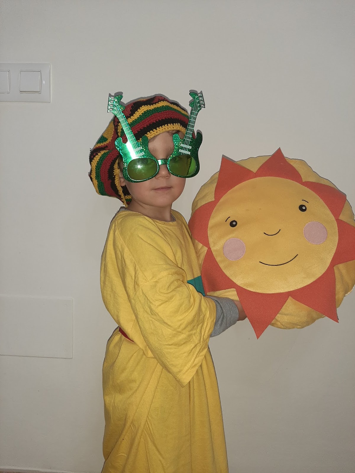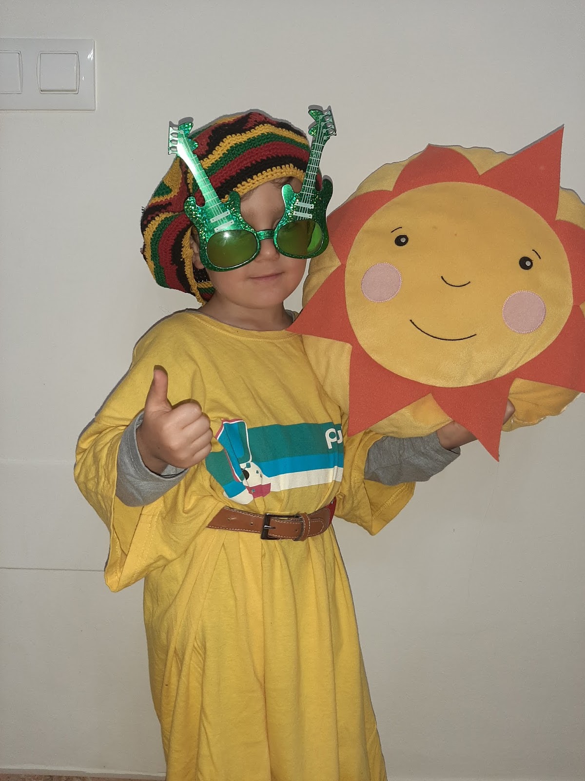 Javi siempre está muy feliz y muy contento por eso se ha vestido de amarillo y lo ha acompañado con un sol también amarillo, un gorro que lleva rayas amarillas y unas super gafas.