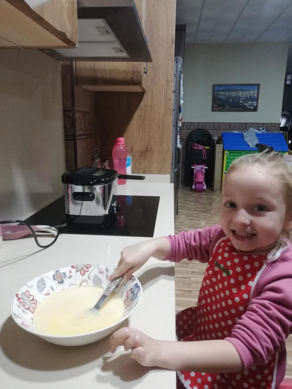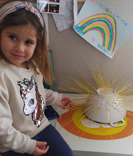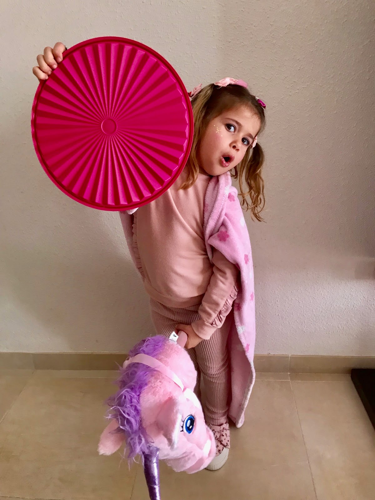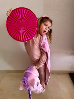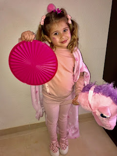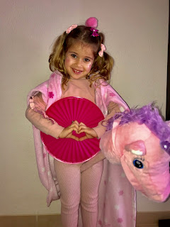 Además me ha dicho que su disfraz rosa es de superheroína y por eso lleva capa, escudo y por supuesto caballo.