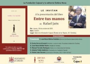 La Fundación Cajasol y la editorial Ánfora Nova presentan el libro Entre tus manos de Rafael Jaén. En el acto acompañarán al autor Antonio Pulido, presidente de la Fundación Cajasol, José M.ª Bellido, alcalde de Córdoba, Manuel Torralbo, rector de la UCO, Carlos Herrera, periodista, locutor de radio y prologuista del libro, y José M.ª Molina, director de la revista literaria Ánfora Nova. …