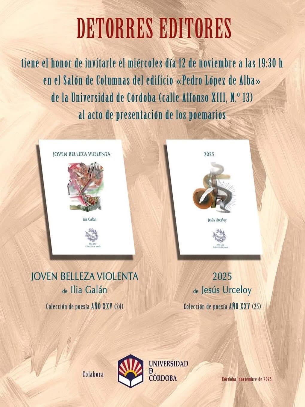 Detorres Editores presenta los poemarios «JOVEN BELLEZA VIOLENTA» de ILIA GALÁN y «2025» de JESÚS URCELOY