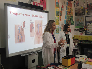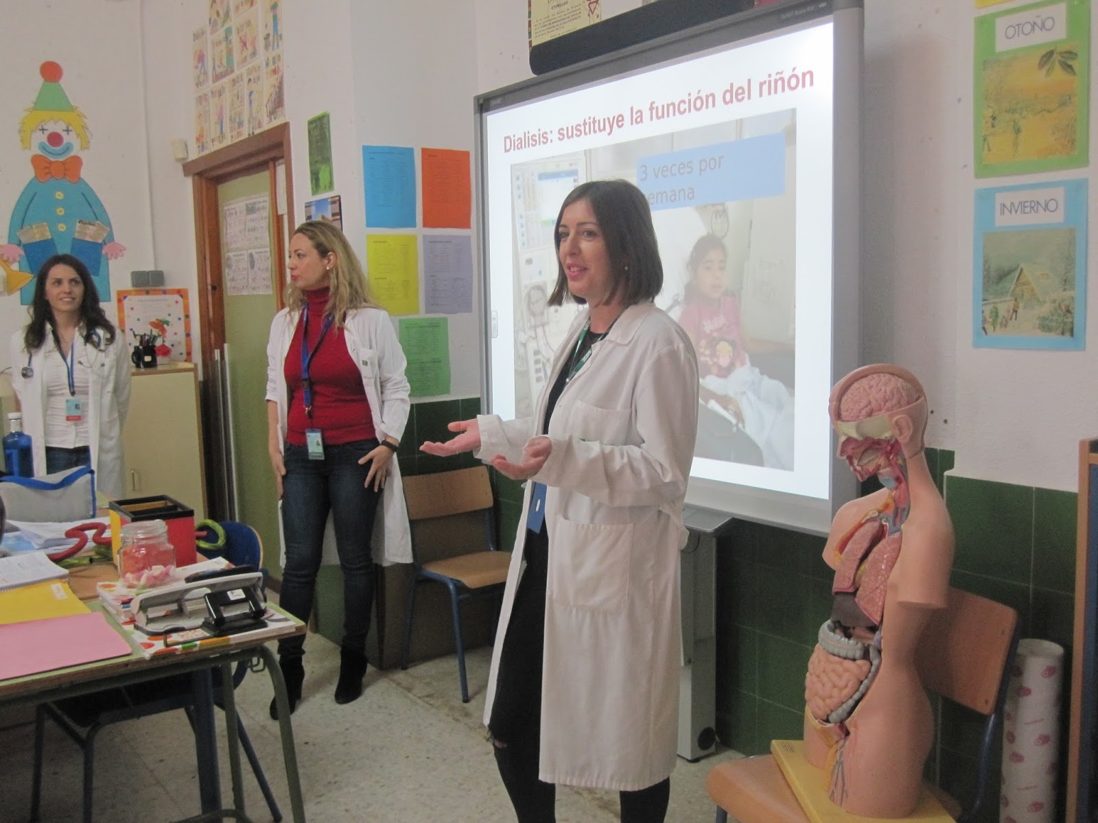 El pasado lunes 7 de Marzo con motivo del día mundial del riñón que se celebra el próximo 10 de Marzo, nos visitaron  la Nefróloga Isabel, y las enfermeras Conchi e Inma, del Hospital Poniente, para darle a la clase de 6º una charla sobre todo lo relativo a los riñones, su ubicación, para que sirven, cuales son sus funciones, su importancia dentro del cuerpo humano, prevención de enfermedades y algunos datos sobre diálisis y trasplantes.