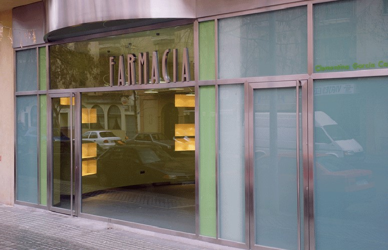 El elemento de carpintería de fachada, ejecutado en toda su envergadura igualmente en una única pieza de acero con resolución de encuentros en limados ingletes, con vidrios transparentes para el tratamiento del espacio comercial y translúcido para el de rebotica, resuelve en concepto unitario toda la relación con el exterior. Disponiéndose en en fachada accesos diferenciados para clientes y proveedores.