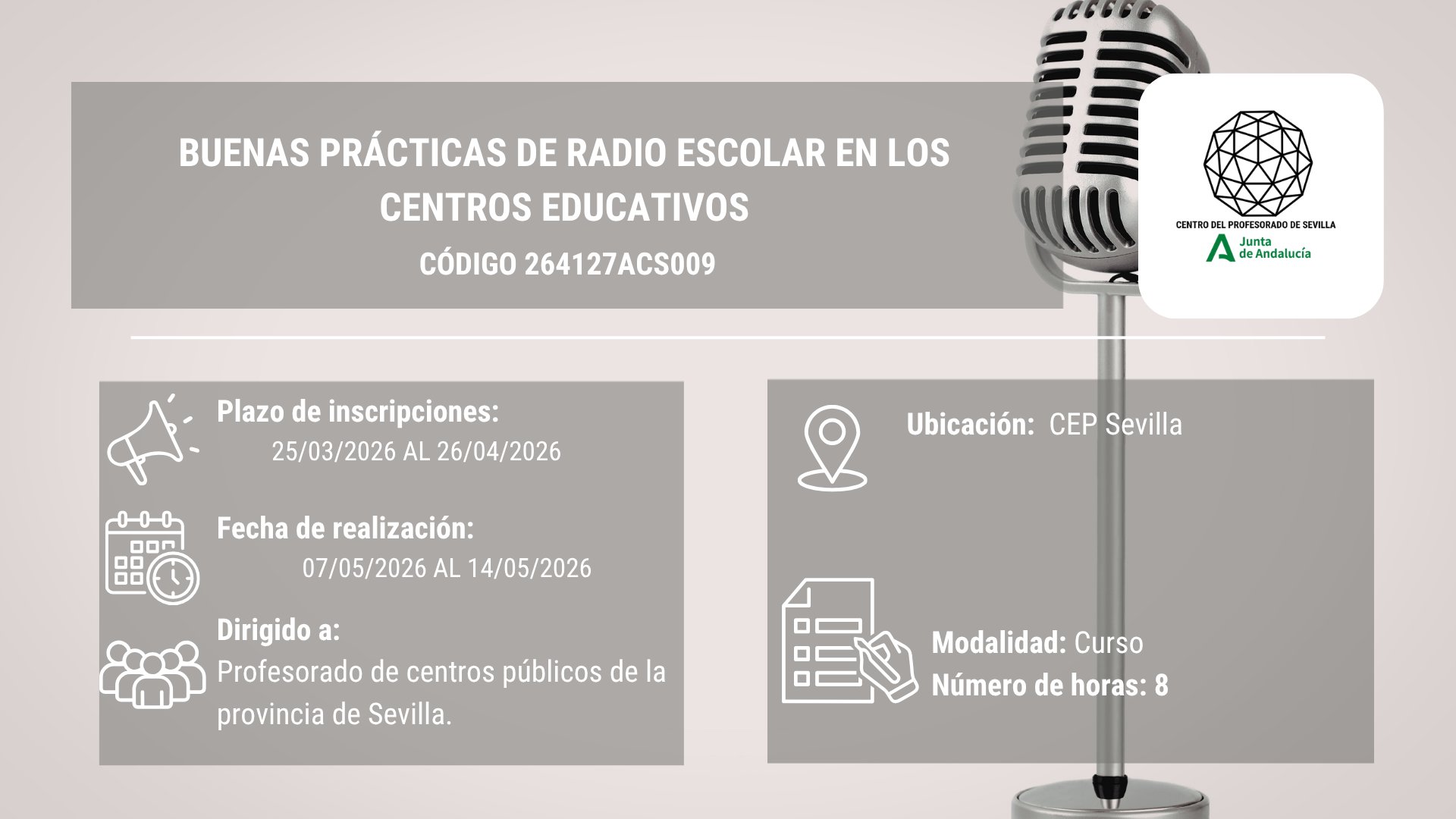 Las bases del programa subrayan que los podcasts y programas de radio deben tener una duración de entre 5 y 15 minutos, con un título representativo de su temática, y una participación equilibrada del alumnado, siempre con apoyo docente. Además, se insiste en el uso de recursos sonoros libres de copyright y en el cuidado de la calidad técnica, el estilo, la modulación y la entonación.