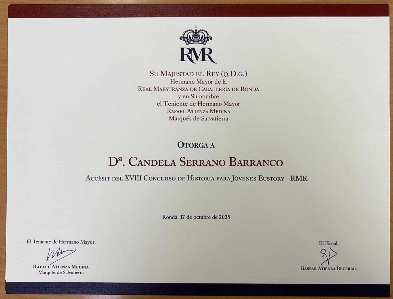Felicitamos a nuestra brillante alumna de 2.º de Bachillerato, Candela Serrano Barranco, por haber obtenido un Áccesit en el XVIII Concurso de Historia para Jóvenes EUSTORY-RMR, cuya temática en esta edición ha sido “Mi familia en la historia”.