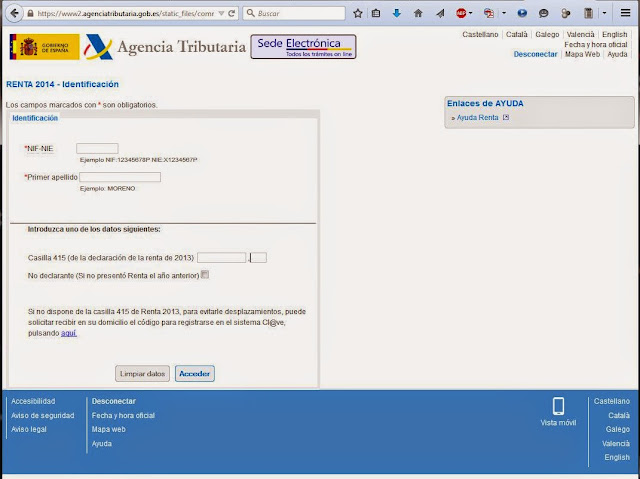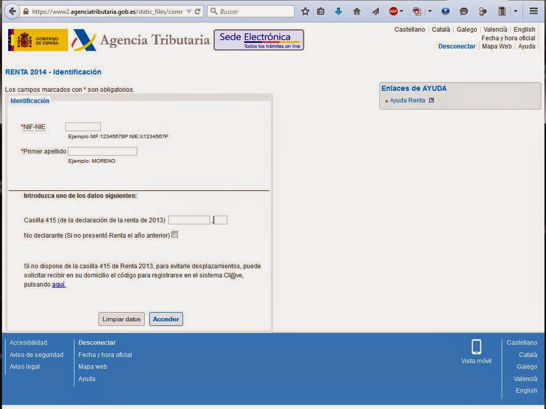 Buscamos la web de la Agencia Tributaria, para ello basta con poner en el navegador renta 2014 y normalmente el primer resultado que nos salga es el bueno: