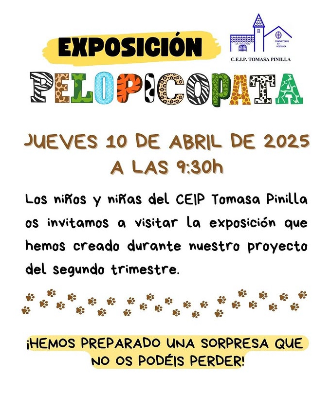 Como producto final del proyecto ABP Pelopicopata, el alumnado del CEIP Tomasa Pinilla invitamos a nuestras familias y vecinos de Guadalcacín a visitar la exposición que hemos creado con los trabajos que hemos elaborado durante todo el proyecto.