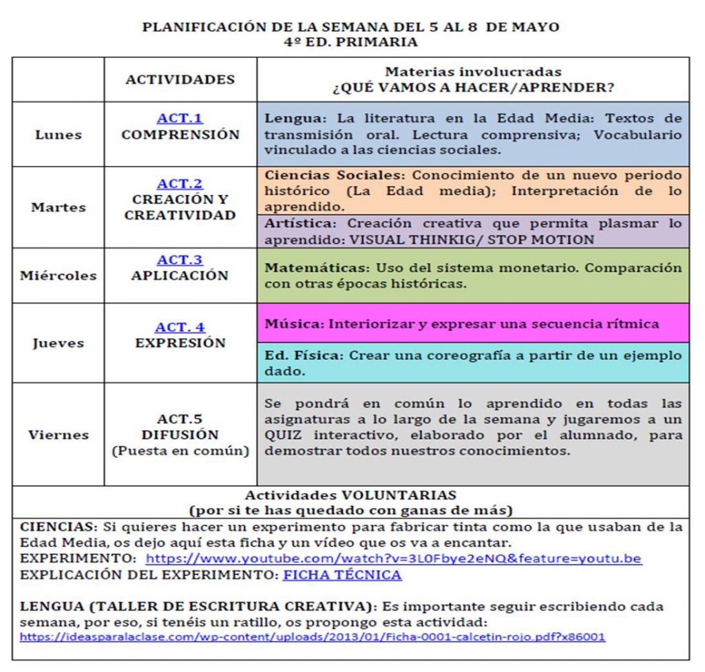 Ya está listo el plan de trabajo para esta semana. Como sabéis, nos adentraremos en la Edad Media. Sé que algun@s teníais ganas de llegar a esta etapa de castillos, batallas y música única. Pues aquí tenéis las actividades que acordamos el viernes en nuestra videoconferencia.