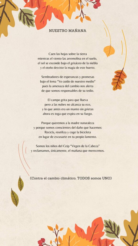Hoy lunes, aunque el otoño se resiste, hemos realizado un recital de poesía con esta temática, cada grupo ha ido leyendo sus poesías, de diferentes autores y dificultad, se ha leído también una poesía dedicada a los niños/as de nuestro cole que nos ha hecho llegar una mamá, Gloria Zuñiga, que se titula “Nuestro mañana”.